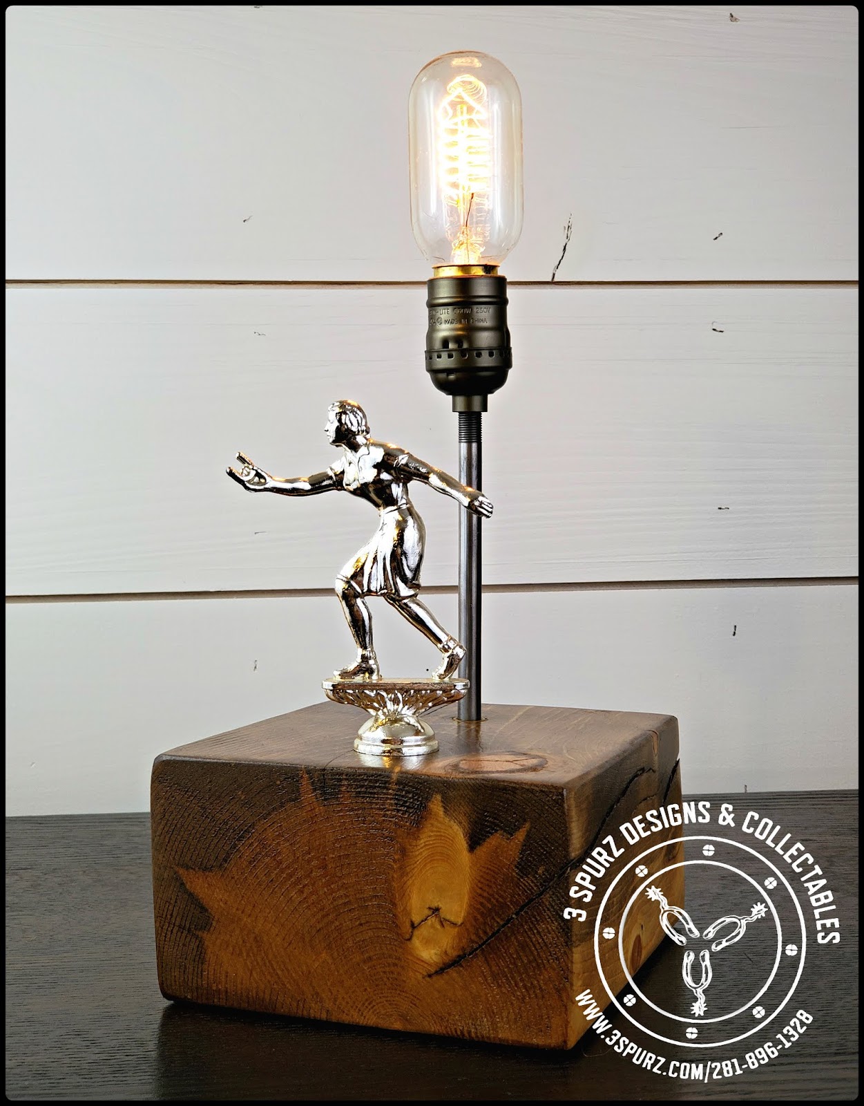 Below is the first designs of our vintage trophy & hood ornament touch lamps. Each lamp is adorned with a metal trophy topper from a vintage trophy or a vintage hood ornament. The light is wired so that the trophy/hood ornament is the switch and they are 3 way lamps.